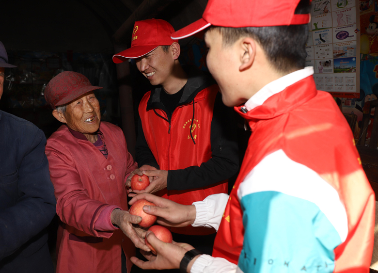 發(fā)完衣物,志愿者們來到困難群眾張登忠家中進行義務勞動。老人家前段時間上山撿柴不慎摔倒,導致左側(cè)兩根肋骨骨折,行動盡為不便。大家為老人送來了米、面、油等慰問品,并幫助老人整理了院子,碼放柴火,令張登忠一家非常感動,他的老伴拿著蘋果一個勁地往大家手里塞,“孩子們,別忙了,坐下來歇歇,吃個果子?!薄按竽?,不吃了,我們剛喝完水,您留著吃吧?!贝蠹艺l都沒有去接果子,因為大家都明白那些蘋果是老人家中僅有的一點水果。臨走時,老人和老伴一直將志愿者們送到村口,久久不肯離去。